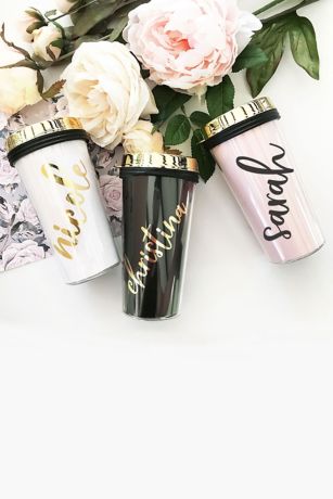 Personalized tumblers are a perfect gift for any coffee lover! Each mug is made of acrylic and comes with a gold twist off lid. Choose a background color, text color and a custom name to be printed for a completely personalized look for your bridal party or a bride-to-be.