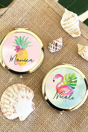 Each compact mirrror features your choice of tropical design on the front and a personalized line of text. These compact mirrors make fun and stylish gifts for your bridal party, friends, and more!
