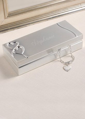 This silver-plated keepsake box is the perfect bridesmaid gift. Personalize this Twin Hearts box, detailed with sparkling cystral, with your bridesmaid's first name ( 9 characters, including spaces) in a script font.