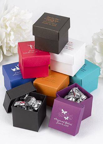 Treat your guests to a favor nestled in these gift-box style boxes. Favor box is personalized with a design of your choice and two lines of personalization in your choice of foil color. For example, bride and groom's names on one line and wedding date on second line. Personalization will allow for up to 20 characters per line including spaces. Enter your event date in the following format - date spelled out (month, day, year).   Purchase multiple colors for a fun new do it yourself look.