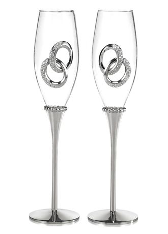 A wedding is just not a celebration unless there is a toast! So toast to your marriage with these gleaming glass flutes. Each flute sparkles with two rhinestone-accented rings and shining stems.