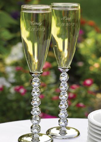 When your wedding is all about the bling, these are the perfect toasting flutes for you! Large, sparkling rhinestones set in silver plating form the stems of the flutes for the ultimate shine. Flutes stand 10" tall. Flutes are personalized in your choice of font with two lines of personalization such as bride's name and wedding date on one flute and groom's name and wedding date on the other flute. Personalization will allow for up to 25 characters per line including spaces. Enter your event date in the following numerical format - mm.dd.yyyy. Flute holds 7 ounces.