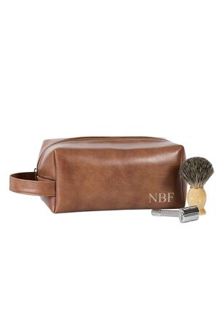 The handsome brown vegan leather dopp kit is complemented by a convenient side handle and wide zippered opening. Spacious enough to hold all your travel essentials, this travel dopp kit makes a great gift for groomsmen, spouses, and friends.