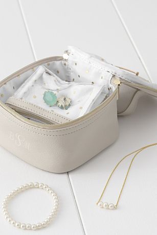 Take your jewelry safely to your wedding venue with ease with the Vegan Leather Jewelry Organizer. This travel case features several compartments that unfold to keep your jewelry safe. Each compartment is secured with a zippered closure and folds back in to save space. Engraving Options: May be personalized with a monogram at no additional cost.