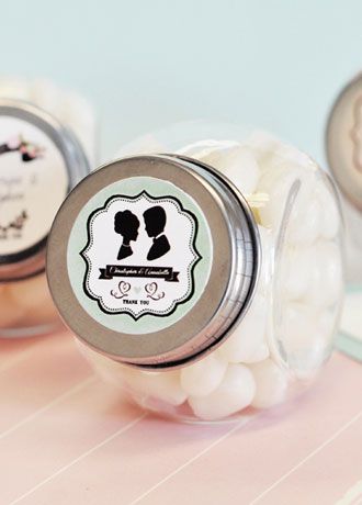Accessorize your shabby chic wedding with some Vintage Wedding Personalized Candy Jars. These mini glass jars are easy to fill with candy, spices, and many other goodies. With reusable wedding favors like these, your guests will remember your special day for years to come. Jars come personalized with your names, date (or message), and personalized theme.