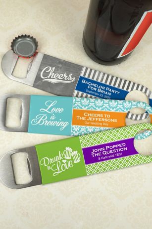 Heavy duty personalized vinyl grip stainless steel paddle style bottle openers are a unique wedding favor, groomsmen or bridal party gift. The comfortable vinyl coating makes it easy to grip while wet. This bottle opener favor is the perfect gift that will be used by your guests year after year.