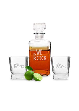Add some Rock to your wet bar collection with our We Rock Decanter Glass Set. This 3 piece set features a large engraved decanter with "We Rock" and two engraved low ball whiskey glasses with one custom line preceding the word "Rocks". It will be a perfect addition to any home.