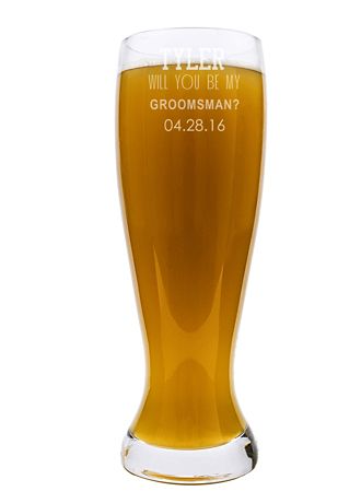 Ask your groomsmen or best man to be in your wedding with the Personalized Will You Be My Groomsman XL Pilsner Glass. Perfect for beer lovers, this enormous pilsner holds up to 54 ounces of their favorite brew and is custom engraved for each groomsmen.