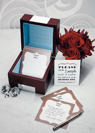 A Memory Box presents an easily personalized alternative to the traditional guest book. Please search style # 9163 for the stationery available which will nestle perfectly inside the box. The stationery can be left out for guests to write their own personal message on, which when completed will be placed inside the keepsake box. A sign is supplied which will ensure that the guests know what is expected of them. The finished memento is a richly colored wooden box containing the well wishes and advice from all those that attended the wedding. Both stylish and sturdy, the Memory Box will stand the test of time and hold the precious memories to be enjoyed in years to come.
