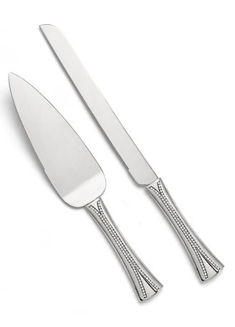Shining almost as bright as your wedding rings, this serving set will sparkle brilliantly on your wedding day! The nickel-plated knife and server set features double rows of glittering rhinestone accents on the handles.