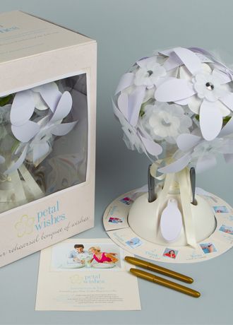 This unique wedding rehearsal bouquet of wishes replaces the usual ribbon and paper plate bouquets made at most bridal showers. Gather friends and family to share their dreams and wishes for the happy couple. Think of a wish advice or a special thought to share with the bride and groom. Using the enclosed metallic pens write your wish on a blank petal. Snap all the petals in place to create a beautiful wedding rehearsal bouquet. Then give the bride-to-be her bouquet of wishes. It's also fun to share the wishes with the other party guests; it is a great way to help folks mix and mingle. Customize the bouquet by tying in ribbons and tulle in the wedding colors or just favorite colors. Every detail should be special even the rehearsal bouquet!