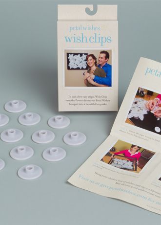 Turn your wonderful Petal Wishes bouquet into a beautiful keepsake with Petal Wishes Wish Clips. The Wish Clips help to turn your rehearsal bouquet of wishes into a beautiful framed keepsake. Following the big event you can remove all of the bouquet flowers and snap into the wish clips. Using a shadow box frame available at any craft store you simply remove the paper backing on the clips revealing the adhesive and adhere to the shadow box it's just that easy! Now you can show off all your good wishes advice and dreams from your family and friends for a lifetime. Shadow box frame not included.