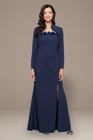 Elegant and sophisticated, this petite bolero jacket dress features a beautifully detailed flower neckline for a timeless mother-of-the-bride or groom look.