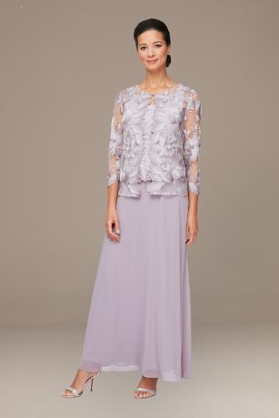 Make an elegant statement in this petite two-piece set, featuring a dress with an embroidered sleeveless bodice and chiffon skirt, and a matching lace illusion open jacket.