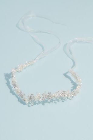 Tiny pearl and crystal flowers add a fresh feel to your hairdo. Finished with satin ribbons.