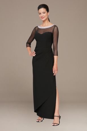 In this petite sheath dress, you'll feel like Hollywood glamour with the illusion sleeves and neckline, embellished with dazzling beads. Jersey fabric gathers at the waist to hug your figure just right before revealing a side skirt slit.