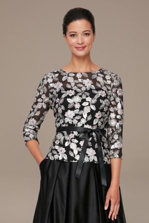 Countless sequins shine from the fitted silhouette of this petite blouse, creating an eye-catching floral design. Illusion three-quarter sleeves, a ribbon tie-waist, and a peplum hem complete the look.
