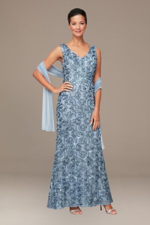 Dimensional soutache ribbon appliques form swirling rosettes on this V-neck mermaid gown, while a matching chiffon shawl pulls the look together beautifully.