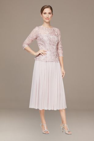 Any mother of the bride or groom will have much to celebrate in this petite tea length A-line, crafted with delicate lace, an illusion neckline, and scallop detailing.