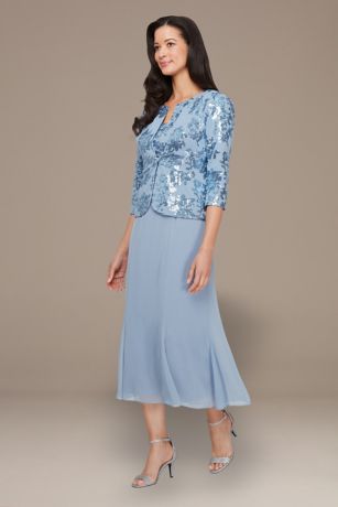 This petite tea-length jacket dress shimmers with sequin detailing on the bodice and jacket, while the flowing chiffon skirt adds graceful movement. Perfect for the mother of the bride or groom!