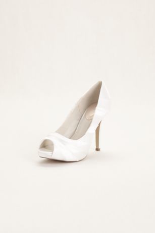 • Pretty shoe features a full back peep toe covered platform with lovely reverse overlay satin banding.