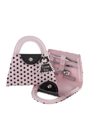 Add some cosmopolitan flair with these manicure sets fashioned to look like ultra-chic purses! The 4 piece stainless steel set includes nail file, scissors, clippers, and tweezers and fits perfectly in the pink and black polka dot purse. A charming purse shaped thank you tag adds to the presentation. Measures 5 1/8" x 5 1/2".