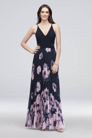This long jersey maxi dress is full of fresh details like a floral-printed pleated skirt, spaghetti straps, and illusion panels at the waist.