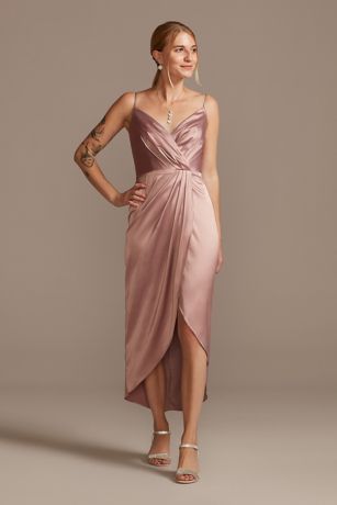 Perfect for parties and bridesmaids alike, this on-trend satin dress features figure-flattering pleating both along the faux-wrap bodice and cascading from the waist of the tulip skirt.