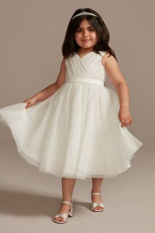Your favorite little lady will love to twirl in this glitter tulle flower girl dress, featuring a pleated surplice neckline, a satin ribbon at the waist, and a full A-line skirt.