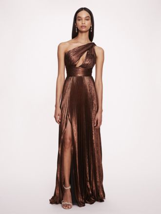 Featuring knife pleats for modern movement and a chic one-shoulder neckline with a keyhole detail, this gorgeous metallic lame gown is made to shine at any special event.