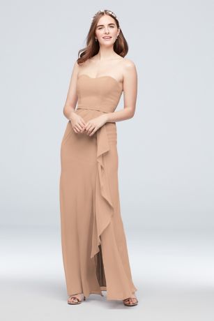 Make an elegant entrance in this classic strapless chiffon gown, updated with a modern cascading ruffle and skirt slit.
