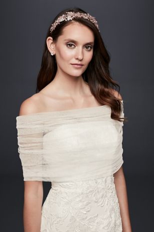 Give any strapless dress a touch of dreamy coverage with this pleated tulle off-the-shoulder topper.
