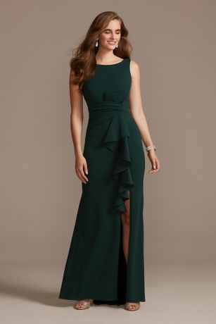 A cascading ruffle floats from the pleated waist of this sophisticated scoop neck dress, while a front slit completes the look.