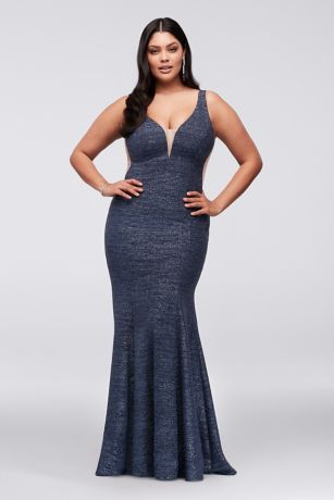 Infused with glitter and finished with an illusion-inset plunging neckline and sides, this curve-hugging mermaid dress makes a sparkling statement.