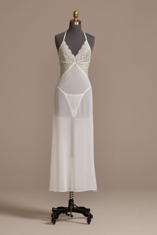Delicate yet dramatic, this sexy chemise nightgown features a plunging lace bodice and an even lower back. Finished with a flowing, floor-length chiffon skirt. Includes a matching thong panty.