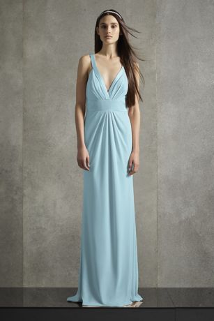 Soft pleats at the plunging bodice and waist add movement to this statuesque-yet-comfortable jersey bridesmaid dress, while tonal satin trim along the V-neckline lends elegant detail. Finished with a chic V-back.