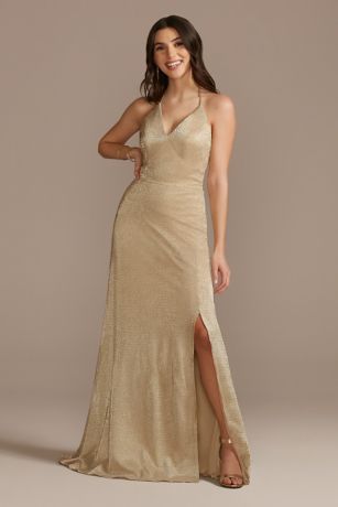 Form fitting and flattering, this floor-length, sparkling sheath dress features a plunging V-neckline, a halter tie, and an open back. A perfect choice for prom or any evening event.