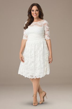 The illusion bodice of this beautiful plus size wedding dress is thoughtfully lined to conceal bra straps while still providing the airy look of lace, as the flatteringly ruched waistband defines the figure. The scalloped lace sleeves and knee-length hemline lend beautiful finishing details. Designed exclusively for plus-size figures.