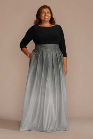 This ball gown is made for those who require an extra dose of sparkle. The three-quarter sleeve stretch knit top keeps things modest and simple, while the full pleated ombre skirt demands all the attention.