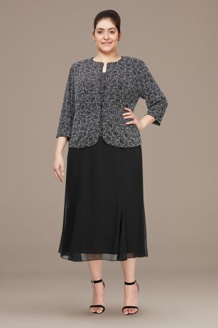 Take a twirl in this tea-length plus size dress and jacket combo. The metallic knit bodice and matching jacket are covered in a glittery geo print, while the mesh skirt is finished with godets at the hemline for lovely movement.
