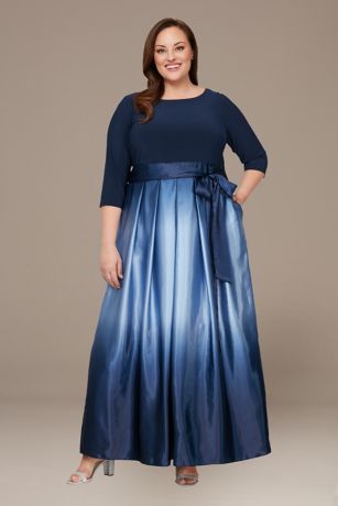 Turn heads in this wow-worthy special occasion plus-size gown, featuring a fitted, three-quarter sleeve bodice paired with a pocketed, ombre full skirt and sleek plunging-V in back.