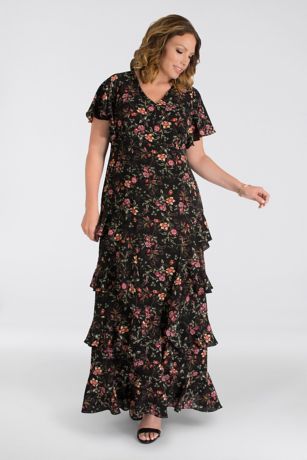 You'll be ready to twirl on the dance floor in this plus size chiffon evening gown with fanciful sleeves and a tiered skirt.