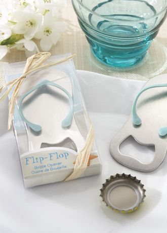 Popping the question might just lead to popping the top--on your favorite drink, that is! Opening yourself to some cool refreshment, this beach-themed party favor is perfect for all sorts of settings...on the beach, at a picnic, tailgaiting or wherever you need to quench your thirst. Guests will keep it handy and think of you every time they use this clever flip-flop favor. Features and facts: Mini flip-flop bottle opener is made of brushed metal with a rubber thong in turquoise. Clear beach-themed display box with a backdrop of the sandy shore is accented with a starfish, the words "Flip-Flop" Bottle Opener and wrapped in natural raffia. Measures 1 1/4" x 3 1/2".