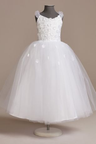Scattered with three-dimensional flowers, this tulle and satin cap-sleeve communion dress is perfect for her special day.