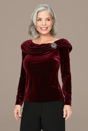 Finished with a jeweled embellishment at the flatteringly ruched portrait collar, this blouse is made of easy, elegant stretch velvet.