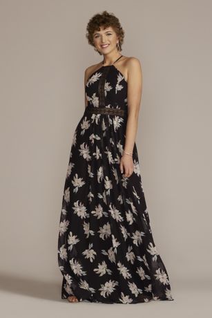 A floral print and halter neck have never looked better together than on this effortless chiffon maxi. Practically begging to be worn to a spring wedding or outdoor event, the illusion details through the bodice and waistline make it the perfect combination of sweet and sexy.