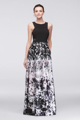The modern angles on the matte jersey bodice of this ball gown are softened by a lustrous, floral-printed satin skirt.