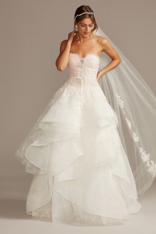 This floral-printed tulle ball gown wedding dress, appliqued with floral corded lace and beading, offers a fresh take on skirt drama: the floating tiered skirt is edged with wide horsehair trim for definition and volume. The lace drop waist bodice features an exaggerated sweetheart neckline with a bit of lace illusion, and is finished with a metallic grosgrain ribbon.