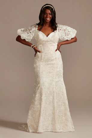 Unique, boho-inspired details, like statement balloon sleeves and a tassel-tied scoop back, make this wedding dress a dream come true for free-spirited brides. An embroidered floral overlay adds rich texture to the chapel-length train, while lines of lace contour the mermaid silhouette.