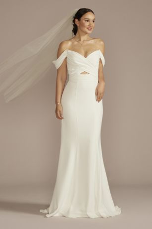Beachy brides will love this breezy off-the-shoulder wedding dress, thoughtfully designed with recycled crepe fabric. The draped bodice crisscrosses in the front, while an elegant sheath skirt completes the look.